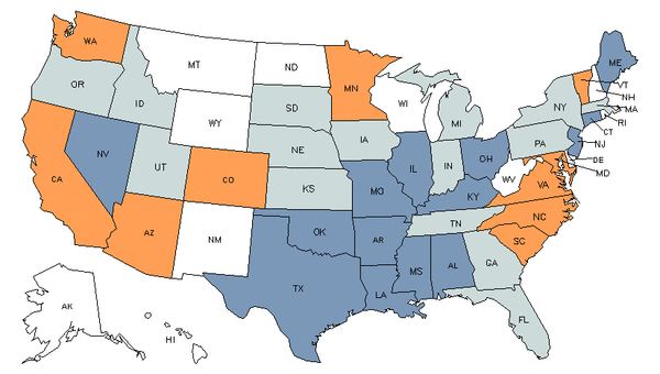• Orange states have an above average share of this career in their workforce.