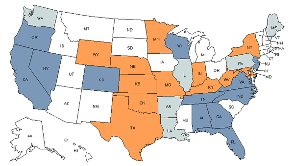 • Orange states have an above average share of this career in their workforce.